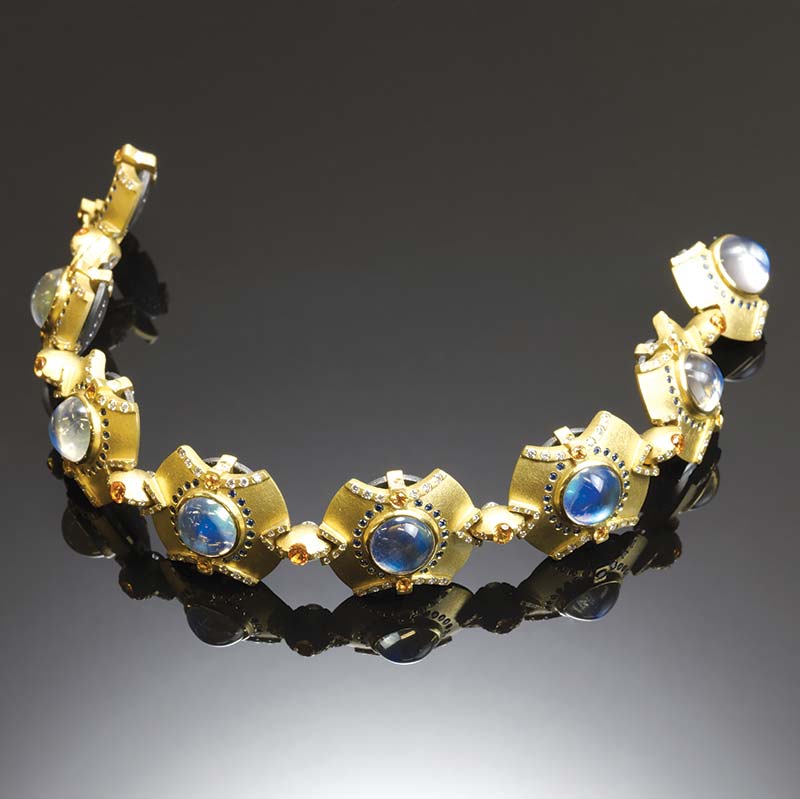 The idea for Robin Waynee’s bracelet—which is entitled ‘Corona/Halo’—is based on rings she made featuring rainbow moonstone with an open back hovering above a blackened silver band. The patina on the silver helps highlight the bracelet’s moonstones.