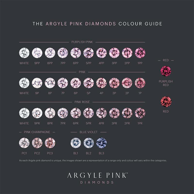 Each category ranges in intensity from ‘1’ (the most intense) to ‘9’ (the lightest). Stones classified as 1PP (intense purplish-pink) are generally the most expensive. The other three colour categories typically found at Argyle are: pink champagne (PC), blue-violet (BL1 ““ BL3), and red, which is the rarest colour of diamond found at Argyle.
